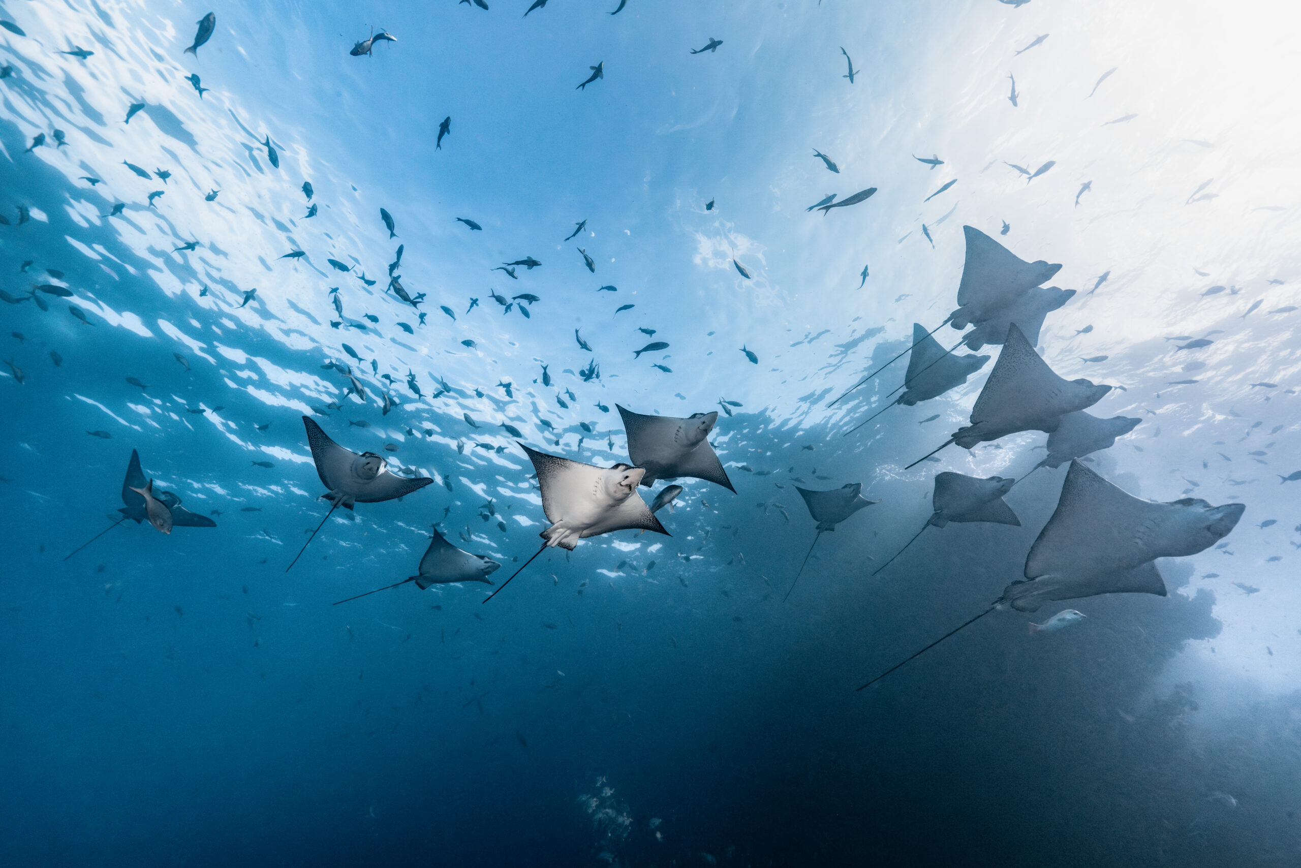 The Galapagos holds the largest shark biomass ever recorded, an average of 17.5 tons of sharks per hectare. Schools of Hammerheads, huge whale sharks and pods of dolphins.
